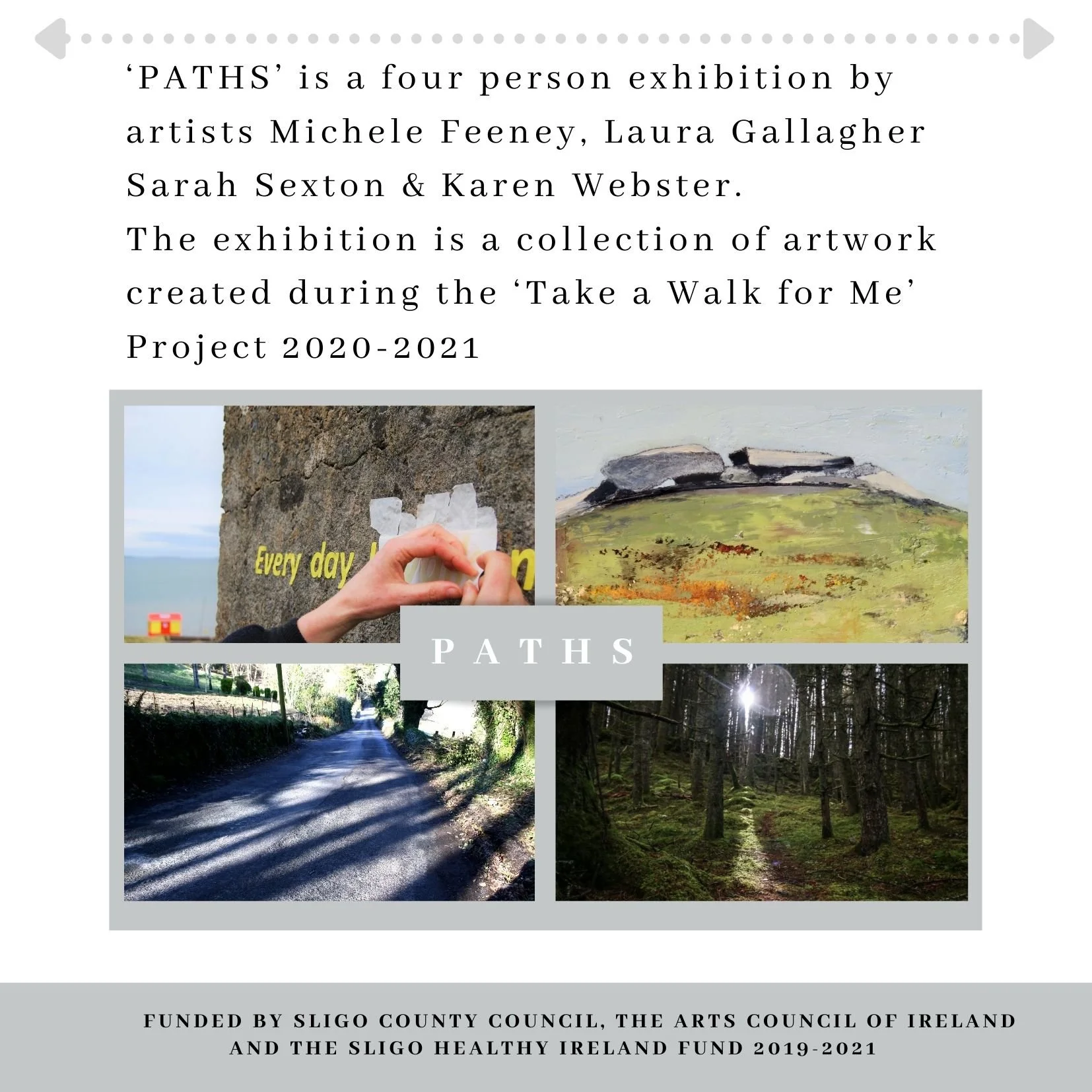 ‘PATHS’ is a Sligo County Council Arts Service programmed exhibition. The exhibition work was created by project artists: Michele Feeney, Laura Gallagher, Sarah Sexton, Karen Webster during the ‘Take a Walk for Me’ project 2020- 2021.